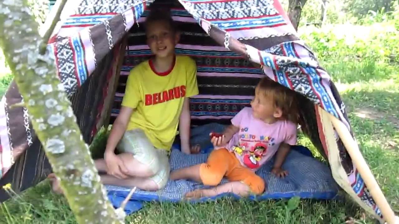 Самый простой и быстры шалаш – это «домик-палатка» . Это домик из покрывал и простыней. Натянуть бельевую веревку. Две простыни, набросить на бельевую веревку и зафиксировать бельевыми прищепками. Снизу с боков палатки края простынь придавить камнями или досками.