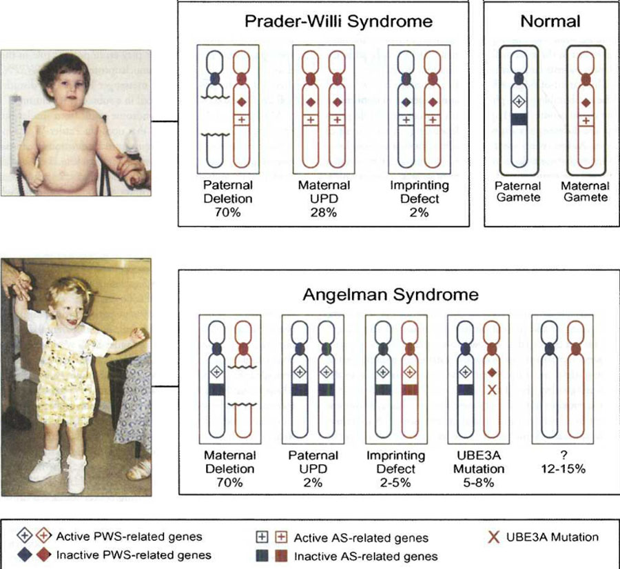 Импринтинг одной и той же области на хромосоме 15 связан как с синдромом Прадера-Вилли, так и с синдромом Ангельмана. В первом случае блокируется отцовский вклад, во втором — материнский
