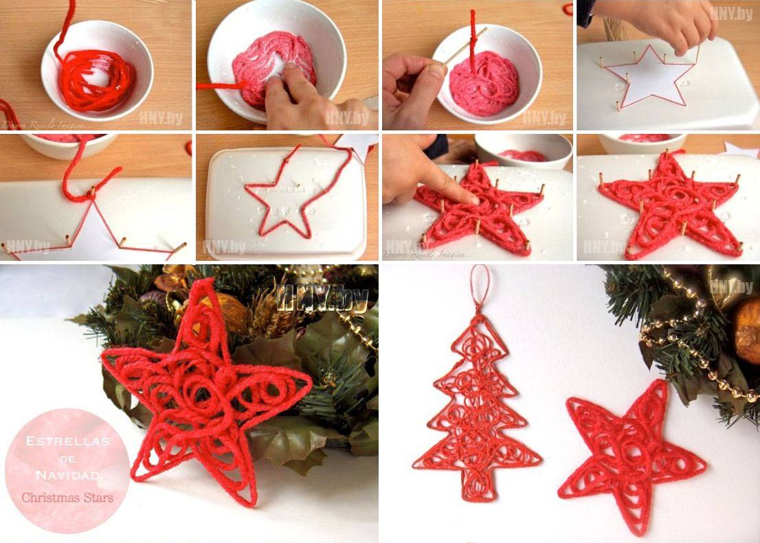 Из ниток для вязания и клея можно сделать оригинальные елочные украшения. Это могут быть звезды, елочки, шары и прочие фигурки. Главное – усвоить технологию, а дальше дело за фантазией. Итак, для изготовления Вам понадобится: толстая пряжа, клей ПВА, одноразовый лоток (термобокс или что-то похожее), английские булавки (можно спички или маленькие гвоздики). На лотке булавками выложите нужную фигурку. Нитки хорошенько промажьте клеем (лучше налейте клей в емкость и поместите туда нить). Обмотайте нить по контуру фигуры, и затем заполните внутреннее пространство. Дождитесь полного высыхания клея и достаньте булавки. Приделайте ниточку и елочная игрушка из клея и ниток готова!