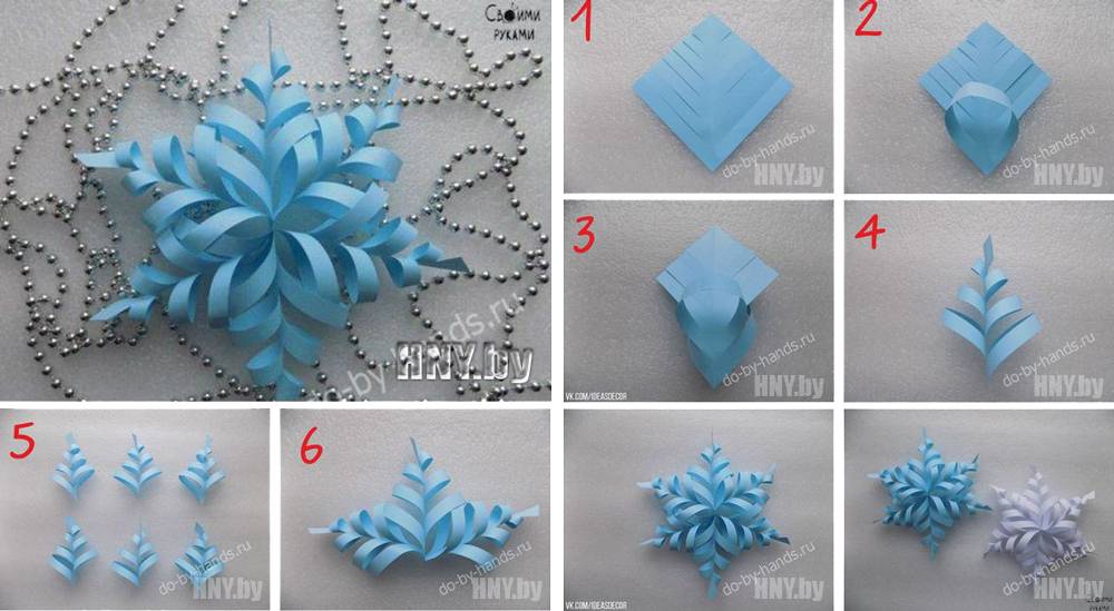 В качестве школьной поделки на Новый год отлично подойдет объемная снежинка из бумаги. Вам понадобится шесть бумажных квадратов. Складываем квадрат по диагонали. Разрезы выполняем на расстоянии примерно 1-1,5 см