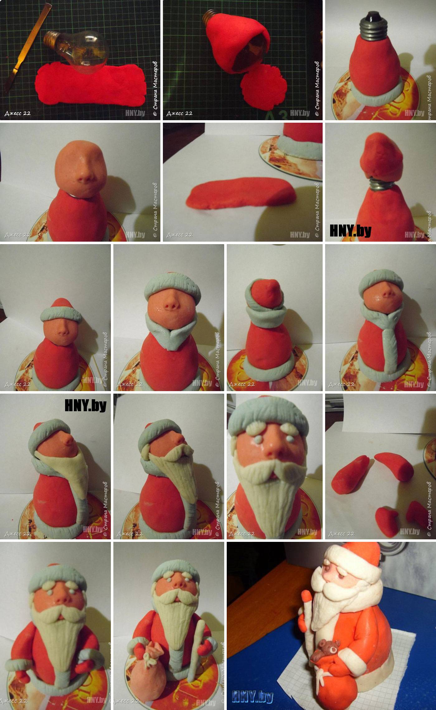 Если у Вашего ребенка есть склонность к лепке, обязательно попробуйте этот мастер класс. Предлагаем сделать Деда Мороза из соленого теста на каркасе из перегоревшей лампочки. Что касается теста, то его можно раскрасить после изготовления фигурки, а можно сразу окрасить в нужные цвета, добавив несколько капель пищевого красителя при вымешивании. Девочкам может больше понравиться идея создания Снегурочки.