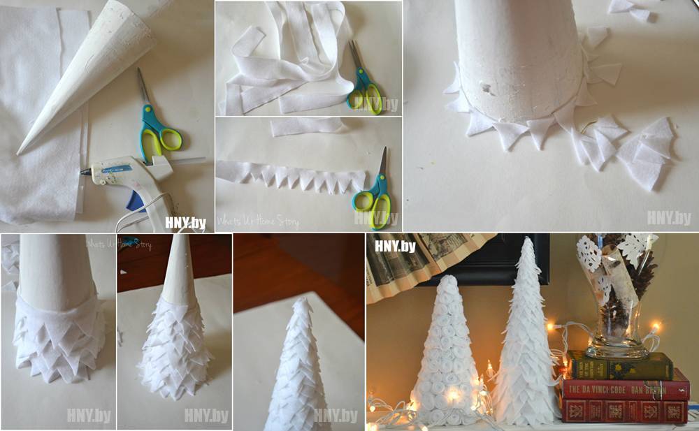 Начнем с самого простого и очевидного – елки. Елочка один из самых неотъемлемых атрибутов Нового года. В 4 класс предлагаем сделать елку из фетра, точнее из миниатюрной фетровой флажковой гирлянды. Для поделки понадобится: конус-основание (можно сделать из плотной бумаги или картона), фетр, ножницы, клей. Пошаговый МК смотри ниже.