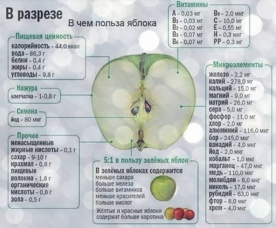 Помимо этого в яблоках содержатся фосфор и железо, которые также необходимы для здоровья костей и зубов, улучшают память и насыщают клетки кислородом.
