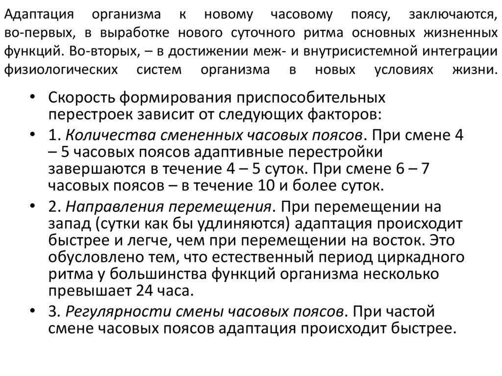 Симптомом акклиматизации в данном случае является бессонница. Либо вы будете жить как бы по старому времени и спать днем вместо ночи. Да и сопутствующая симптоматика прибавится — слабость, недомогание и так далее.