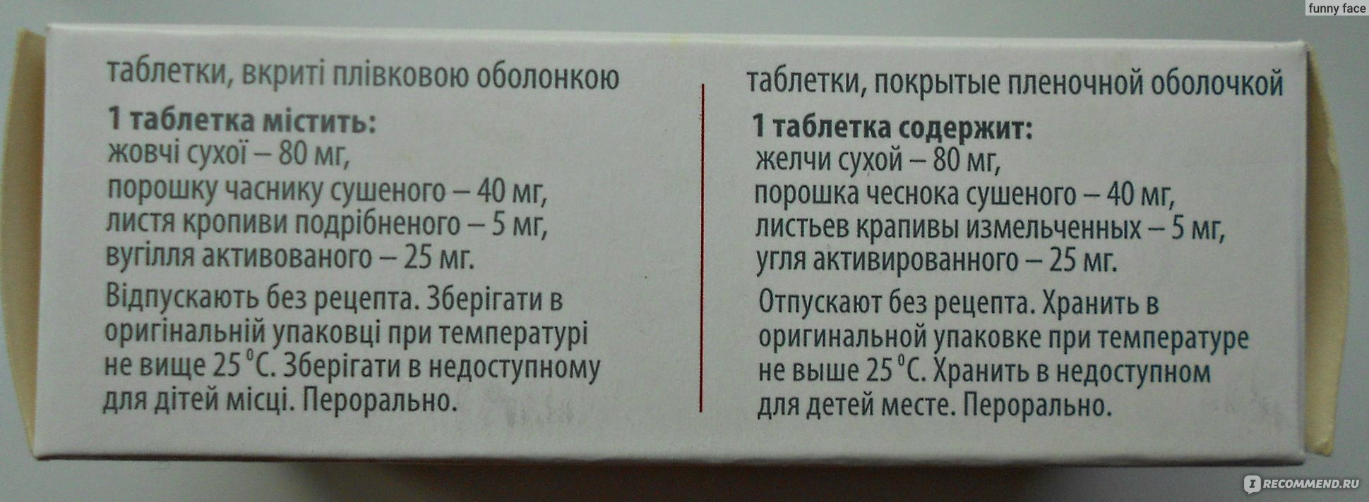 На одну таблетку: Активные компоненты: желчь крупного рогатого скота сухая – 80 мг, чеснок сушеный – 40 мг, уголь активированный – 25 мг, крапивы листья – 5 мг;Вспомогательные вещества: магния оксид (магния, окись) – 11 мг, крахмал картофельный – 43 мг, тальк – 3 мг, кремния диоксид коллоидный (аэросил) – 1 мг, кальция стеарат – 2 мг;Оболочка: сахароза (сахар) – 164 мг, магния гидроксикарбонат (магния карбонат основной) – 35 мг, кремния диоксид коллоидный (аэросил) – 2 мг, титана диоксид – 3 мг, повидон (поливинилпирролидон) – 2 мг, тальк – 3 мг, краситель тропеолин О – 0,04 мг, воск пчелиный – 0,2 мг.
