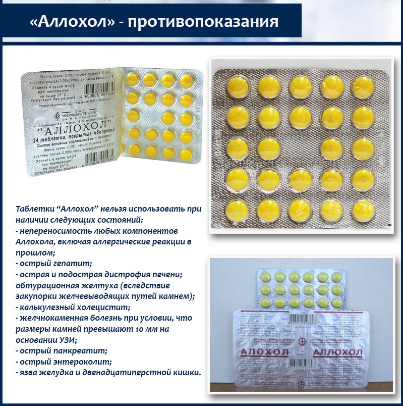 – гиперчувствительность к компонентам препарата Аллохол, – калькулезный холецистит, – обтурационная желтуха, – острый гепатит, – острая и подострая дистрофия печени, – язвенная болезнь желудка и 12-перстной кишки (в фазе обострения), – острый панкреатит, – детский возраст до 12 лет, – дефицит сахаразы/изомальтазы, непереносимость фруктозы, глюкозо-галактозная мальабсорбция (так как в составе сахароза).