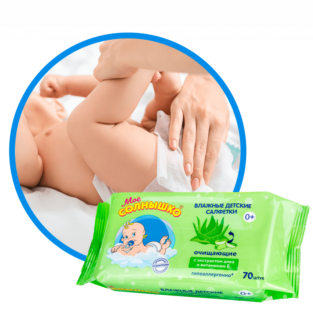 Если у вас нет возможности подмыть ребенка водой с мылом, можно использовать влажные салфетки для детей — например, влажные детские салфетки Мое солнышко очищающие при смене подгузника с экстрактом алоэ и серебром. Они предназначены для ухода и нежного очищения кожи малыша в любых условиях: дома, на прогулке, в поликлинике или гостях. Влажные салфетки легко и бережно удаляют загрязнения, не сушат кожу. Содержат экстракт алоэ, витамин Е, коллоидное серебро и D-пантенол.
