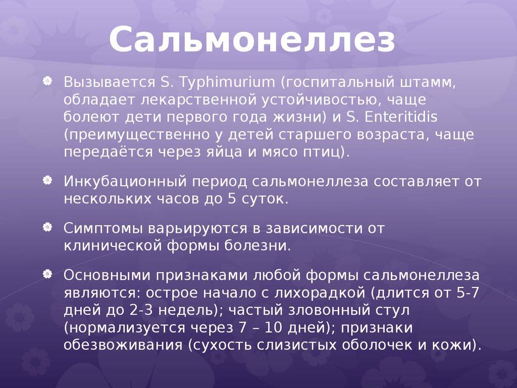 Инфекционное поражение сальмонеллами протекает тяжело и продолжительно. Длительность инкубационного периода зависит от возраста, состояния иммунитета и количества попавших в организм бактерий. Как правило, сальмонеллез у детей проявляется следующими симптомами: