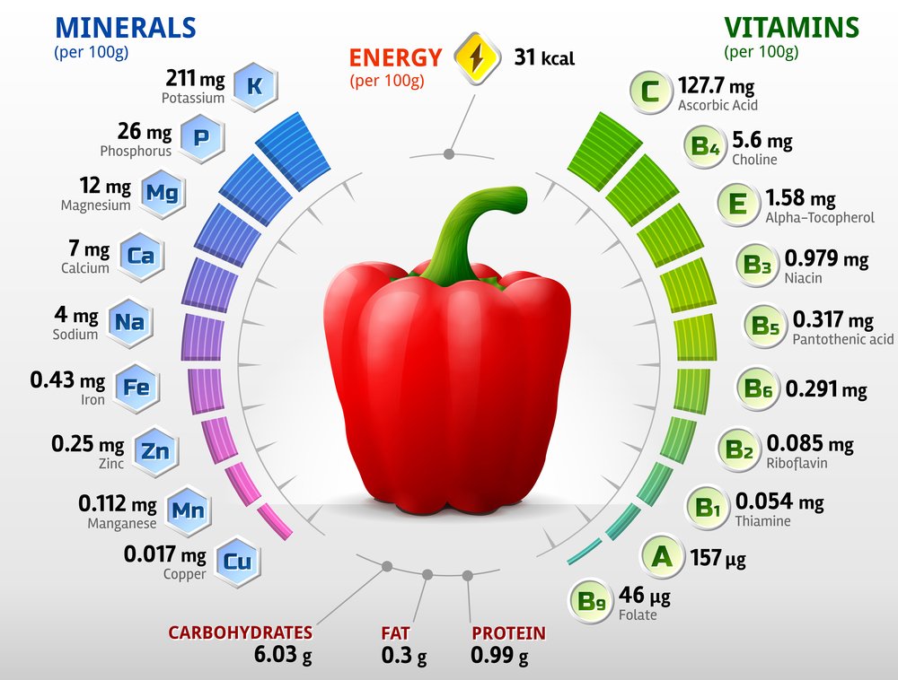 Ученые установили, что в ста граммах перца содержится 90 грамм воды, 1,2 грамма белков, 5 грамм углеводов, 0,3 грамма жиров и 3.5 грамма клетчатки, которая так нужна нашему желудку.
