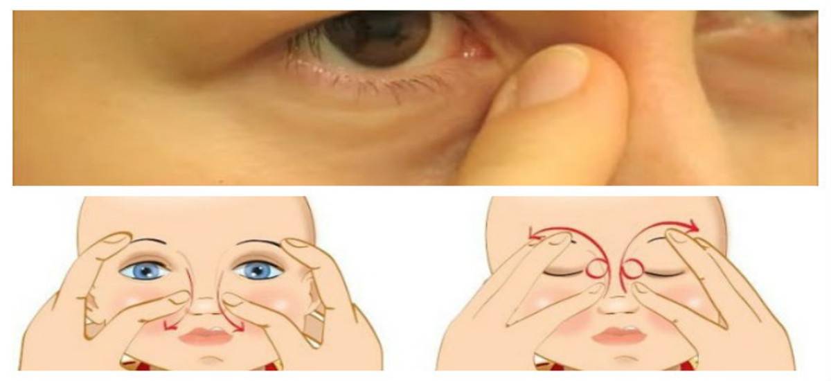 Достаточно установить указательный палец на внутренний уголок глаза ребенка, и нажав на нее, провести пальцем к внешнему уголку, параллельно совершая такие же несильные периодичные нажатия (движение выполняется по нижней части глаза, по нижнему веку и ведет к носу).