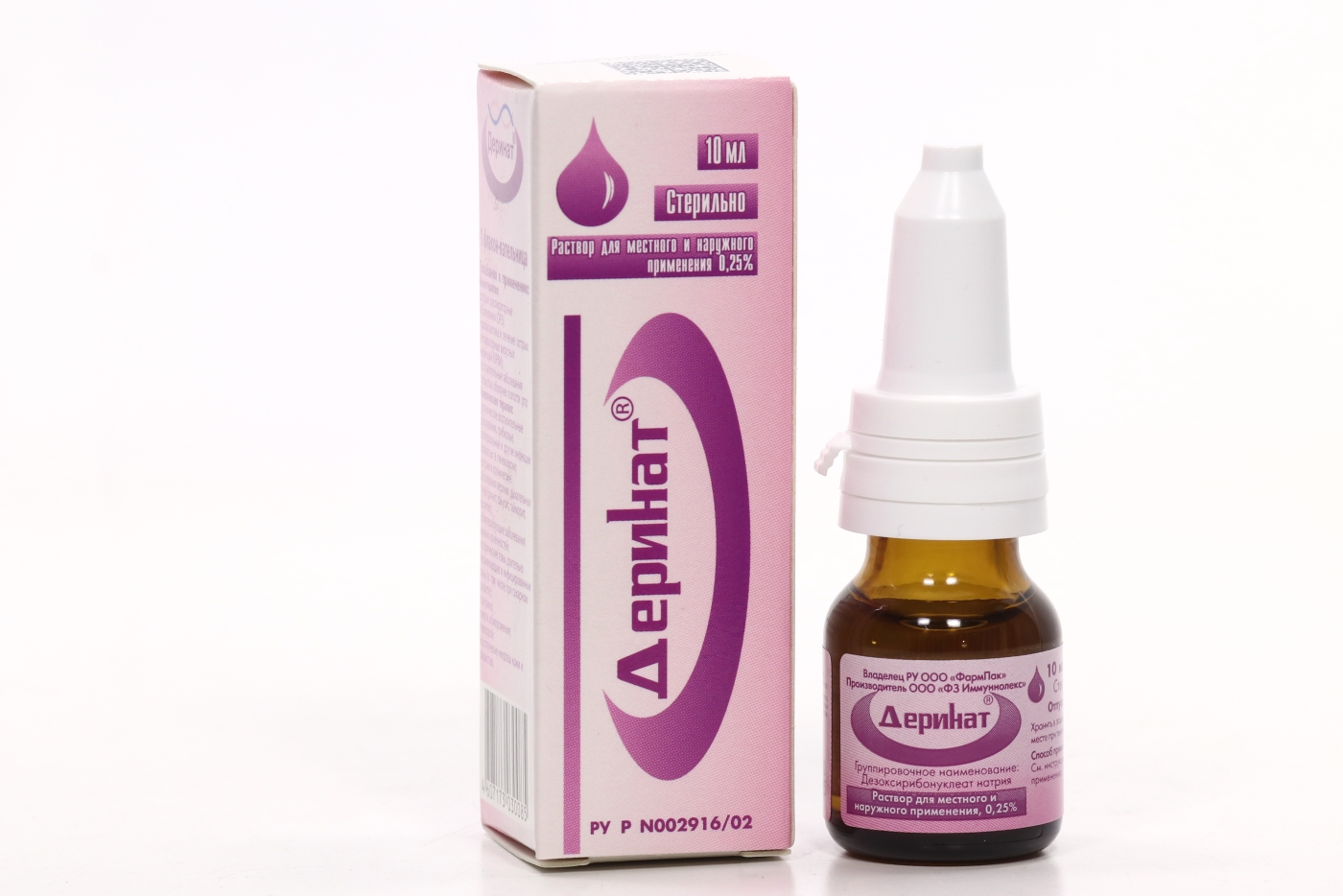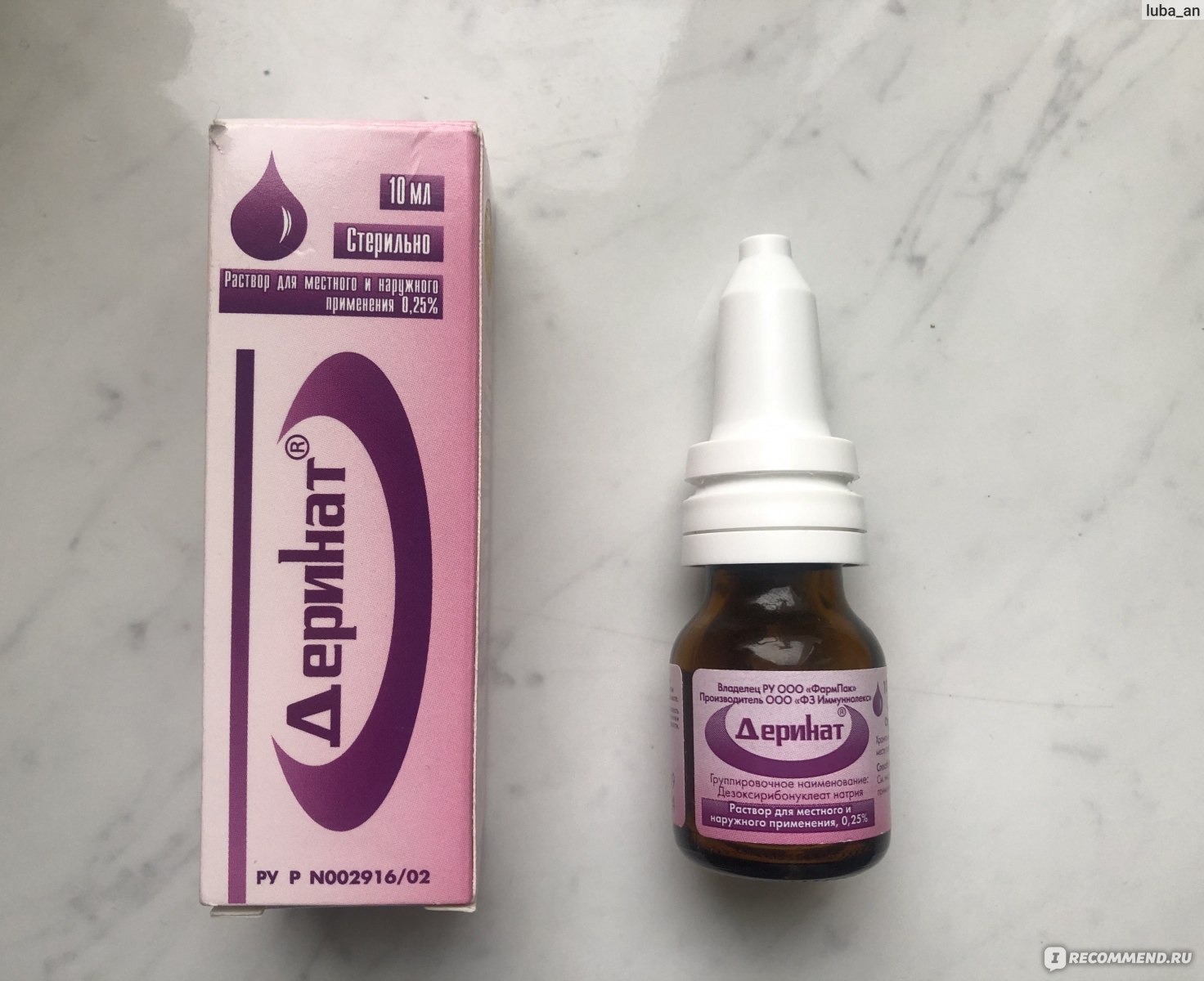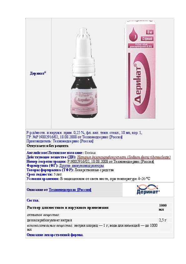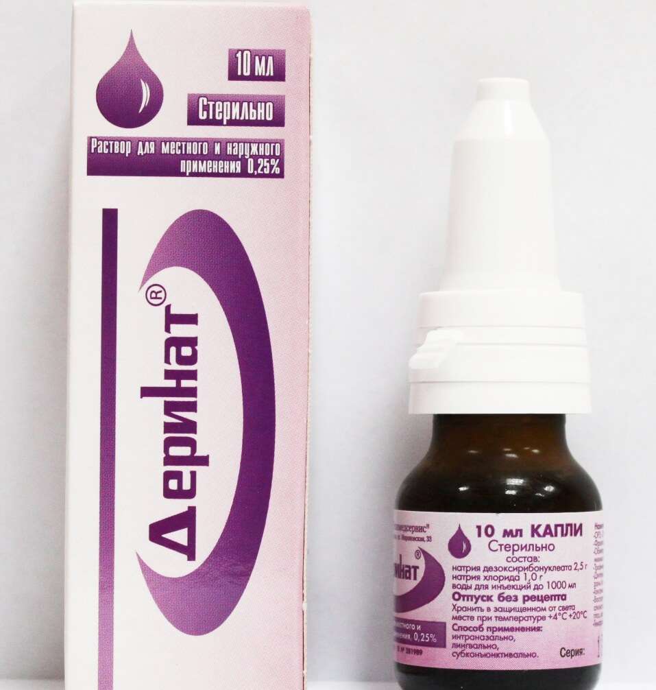 Деринат – это раствор прозрачного цвета не имеющий посторонних запахов, инструкция указывает, что его основу составляет такой компонент как дезоксирибонуклеат натрия. Лекарство обладает широким спектром действия и используется в разных отраслях медицины для лечения не только взрослых, но и детей. Основное действие медикамента иммуномодулирующее.