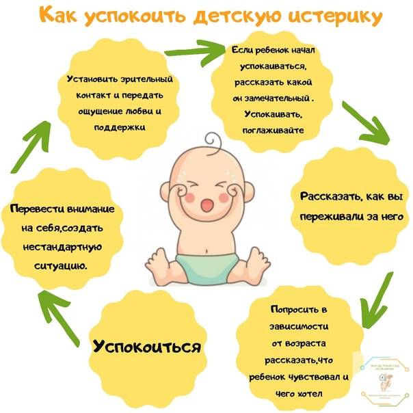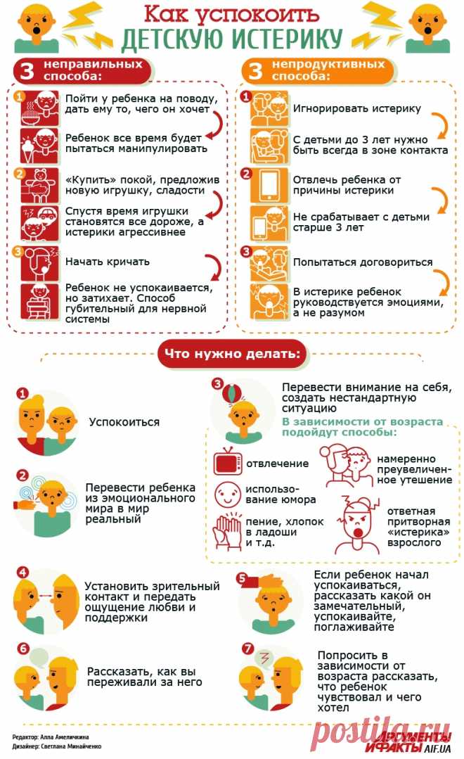В любом случае, если малыш склонен к истерикам (в силу темперамента), щадящий режим дня, достаточный сон, рациональное питание, разумная по нагрузкам и продолжительности физическая и интеллектуальная деятельность в течение суток, спокойные игры вечером, доброжелательные, но с четкими границами дозволенного отношения с другими членами семьи, правильная тактика поведения родителей во время истерики — минимальный набор воспитательных мер, которые помогут восстановить спокойствие в доме.