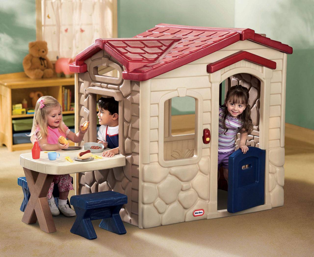 Производители обычно предлагают домики из пластика. Основное преимущество таких конструкций — легкость сборки и компактность. В отличие от деревянных аналогов, их можно легко разобрать и убрать на зиму. Устанавливать такие домики можно как во дворе, так и в доме. Размер можно подобрать не только для самых маленьких (90х90х90 см), но и для более взрослых детей (с полутораметровыми габаритами). Недостаток пластика заключается в том, что он выгорает на солнце и теряет привлекательность под воздействием атмосферных осадков.