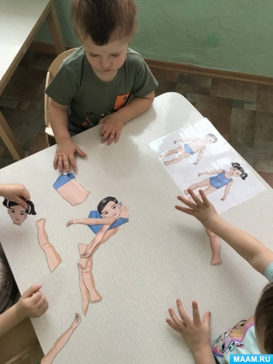 Каждому ребенку раздаются изображения одной части человеческого тела. Готовый вариант создается в группе. Старшим устройте соревнования: кто быстрее правильно соберет человека.