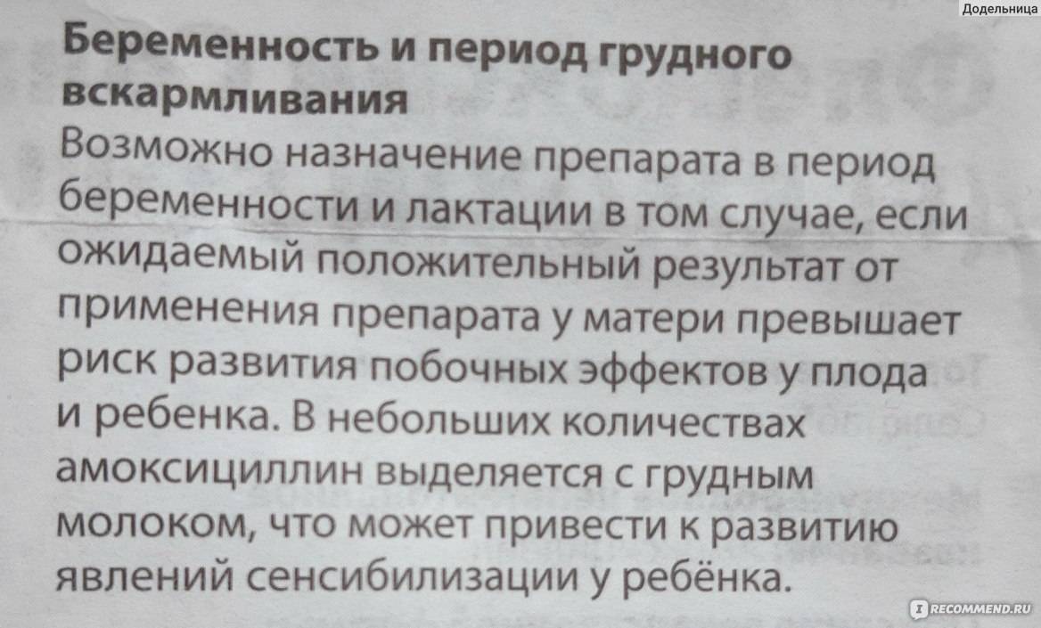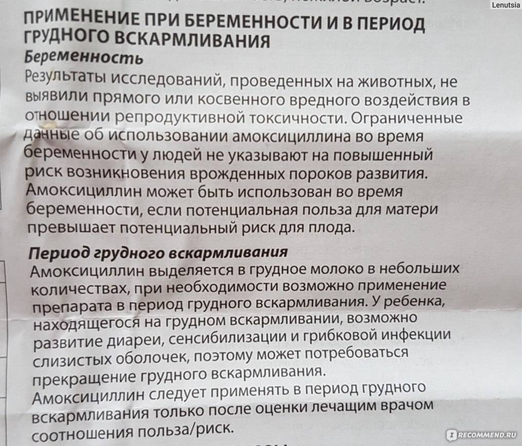 Согласно исследованиям American Academy of Pediatrics (Американской академии педиатрии), амоксициллин допустимо использовать во время грудного вскармливания: разовая доза в 1 г, принятая кормящей мамой, попадает в молоко в незначительном объеме (менее 0,095% от материнской дозы), что не приводят к неблагоприятным последствиям для ребенка. Однако иногда может появиться сыпь и возникнуть нарушение кишечной микрофлоры. Побочные реакции (сыпь на коже, диарея, молочница) были отмечены у 8,3% детей, подвергшихся воздействию амоксициллина.