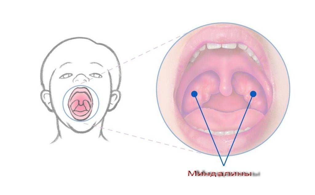 В основном в горле у ребенка можно увидеть слизистую красного цвета, увеличенные и отечные миндалины. Возможно появление налетов разного характера.