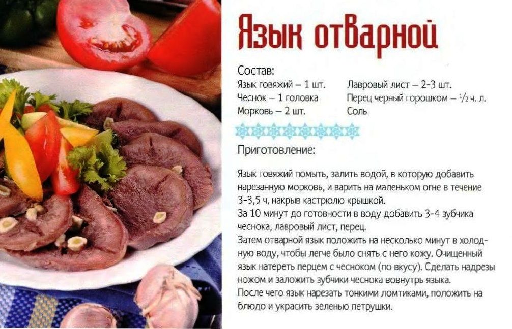 Готовый язык держат 3-5 минут в холодной воде, а затем снимают шкурку. Если шкурка снимается плохо, он еще не готов. Субпродукт употребляют в вареном виде, добавляют в холодные закуски и салаты, горячие вторые блюда и супы. Предлагаем несколько рецептов, которые можно кушать кормящим.
