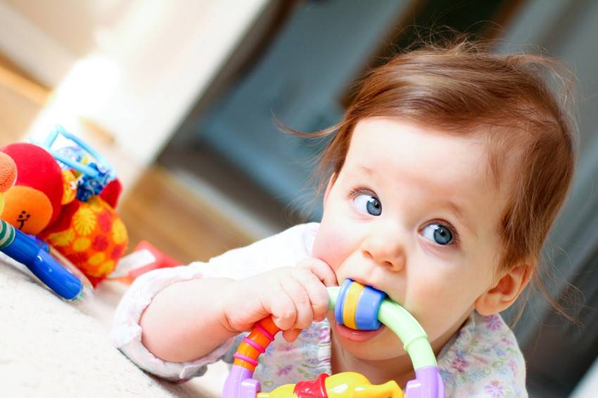 В возрасте около полугода у малышей начинают резаться зубки. Для облегчения состояния десен можно предложить младенцу специальный прорезыватель, который будет развлекать ребёнка в течение долгого времени.