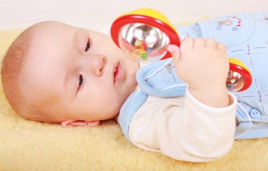 Подрастая, малыш уже пытается трогать погремушку рукой или ногой, в результате предмет издает звуки и еще дольше задерживает внимание
