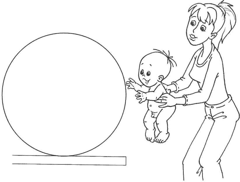 10. Поддерживая ребёнка под мышками, поставьте его ногами на мяч, спиной к себе. Совершая движение вперёд, посадите его на мяч. При обратном движении верните в исходное положение.