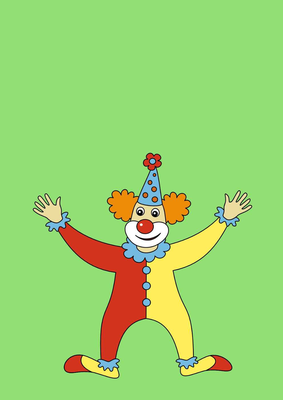 Рисунок с клоуном и белями кругами для мячей, красные и синие мячи из мягкого картона, клей-карандаш.