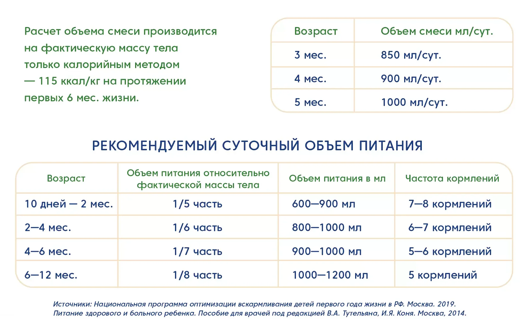 Чтобы определить объём смеси, необходимый для одного кормления, разделим суточный на необходимое число кормлений. Это будет 100 — 130 миллилитров смеси.
