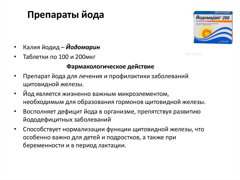Недостаток йода можно компенсировать в организме путем употребления известного лекарственного препарата – Йодомарина (действующее вещество — калия йодид). Рекомендуется Йодомарин при планировании беременности и во время ее течения, что положительно сказывается на развитии ребенка в утробе и здоровье матери.