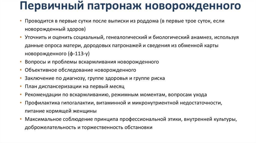Особое внимание уделяется кормлению новорожденного, с тем чтобы помочь маме наладить правильное грудное вскармливание. Врач должен убедиться в наличии у женщины грудного молока, осмотреть молочные железы (состояние сосков), понаблюдать, правильно ли она прикладывает ребенка к груди, рассказать ей о режиме кормлений крохи и о питании кормящей женщины. Во время первичного патронажа новорожденного врач должен рассказать маме обо всех требующих срочной медицинской помощи состояниях малыша и о том, куда надо обращаться в экстренных случаях