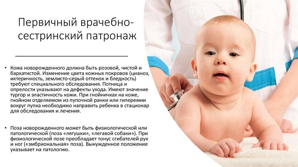 Далее при первичном патронаже новорожденного доктор исследует кожу ребенка: оценивает ее цвет, наличие потницы, опрелостей и т. п