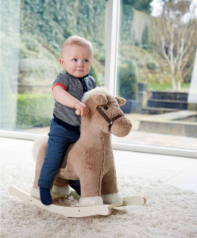 , перекатывая его ребёнку и прося, чтобы он вернул мячик таким же образом вам. Возможно, если игрушка откатится в сторону, у крохи появится желание самостоятельно его достать - Качель или качалка-лошадка