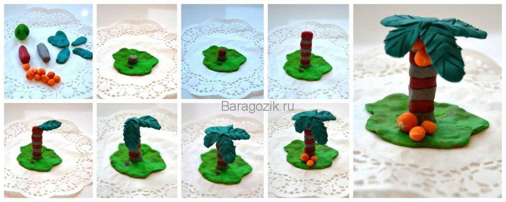 - Чтобы сделать пальму, нужно скатать 1 большой шар зеленого цвета, 2 толстых колбаски серого и бордового цветов, 5 расплющенных колбасок темно-зеленого цвета и 9 маленьких шариков оранжевого цвета.