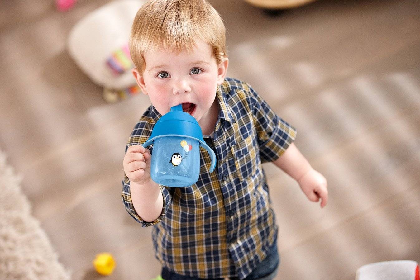 - Сначала ребенка приучают к питью из специальной бутылочки, похожей на чашку с носиком или трубочкой – поильника. Чтобы процесс обучения был успешным и легким – необходимо правильно подобрать поильник и соблюдать правила использования.