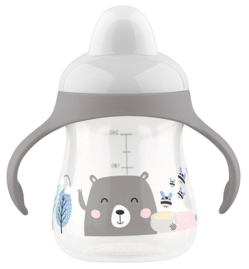 Это приспособление применяется для того, что бы малыш полностью отказался от удобной бутылочки с соской. Носик плотный, за счет чего малыш приучится пить жидкость, а не высасывать ее из емкости. Для изготовления изделия применяется ударопрочный пластик, который с легкостью переживет все шалости крохи. Мерные деления хорошо видны, что позволит контролировать точное количество выпитого.