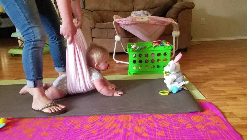 На пол положить валик либо небольшую подушку. Малыша нужно аккуратно уложить грудкой на подушку, при этом сгибаем его ноги и ставим на пол коленками. Далее надо встать к ребенку лицом и тихонько подтягивать к себе подушку. Он начнет немного переставлять коленками.