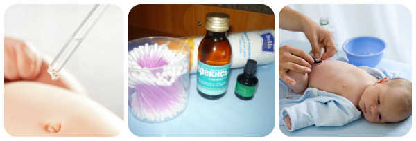 на сухую поверхность пупочной ранки наносится дезинфицирующее средство (зеленка, йод, марганец и другие);