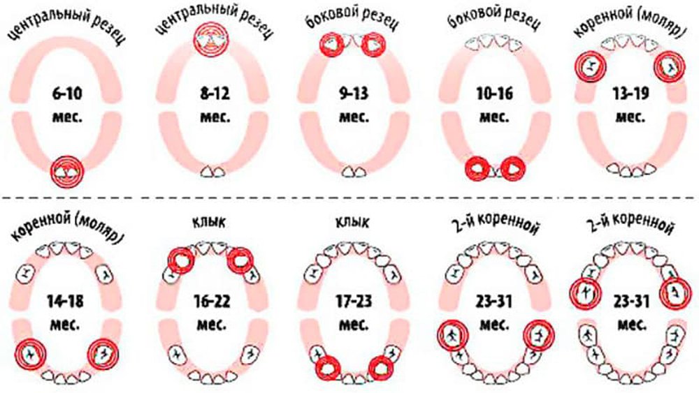 ; Нижние центральные резцы (6-10 месяцев). ; Верхние центральные резцы (8-12 месяцев). ; Верхние боковые резцы (9-13 месяцев). ; Нижние боковые резцы (10-16 месяцев). ; Верхние клыки (16-22 месяца). ; Нижние клыки (17-23 месяца). ; Нижние моляры (2-2,5 года). ; Верхние моляры (2-3 года).