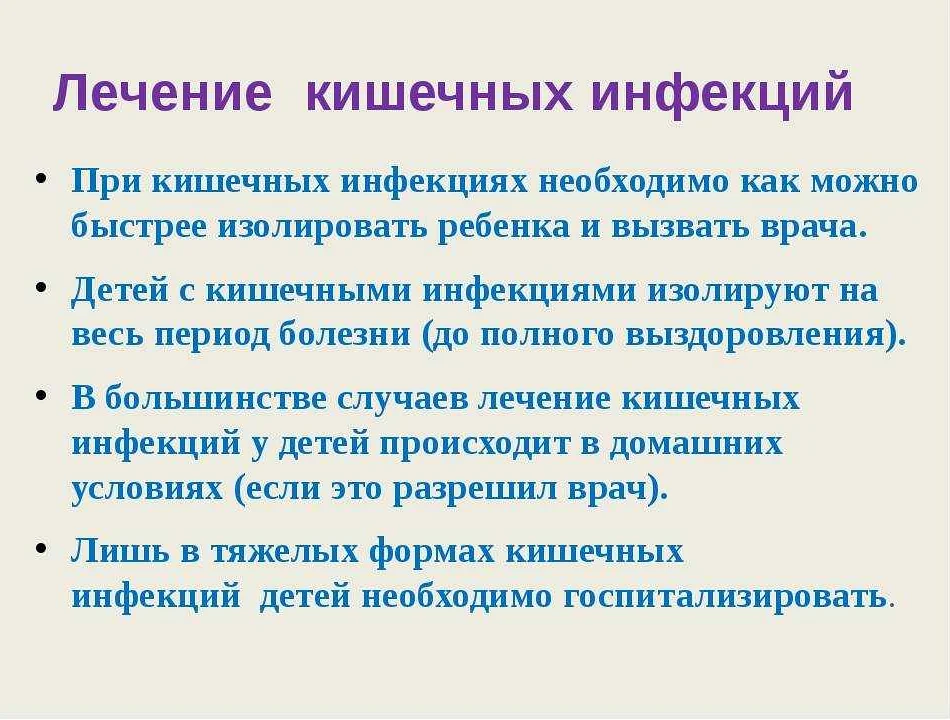 В большинстве случаев у ребенка появляется обильная рвота и симптомы колита — спазмы кишечника. Каловые массы могут быть окрашены в зеленый цвет и иметь в своем составе слизь. При тяжелом течении инфекции в испражнениях можно заметить кровь. Позывы на дефекацию крайне болезненны. Лечение бактериальной кишечной инфекции требует назначения антибиотиков. Чаще всего ребенка госпитализируют на период лечения в инфекционную больницу.