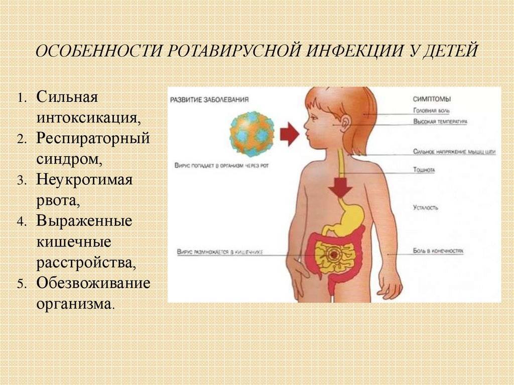 Возбудители инфекции, попадая в кишечник, начинают размножаться, отравляя организм токсинами, что приводит к появлению характерных тяжелых симптомов. Дети гораздо более восприимчивы к инфекциям, чем взрослые. Это обусловлено тем, что защитные силы организма у них слабее, микробы быстро распространяется по различным отделам более короткого кишечника. К тому же кислотность желудочного сока у ребенка ниже, чем у взрослого, поэтому жизнеспособность патогенных микроорганизмов выше.