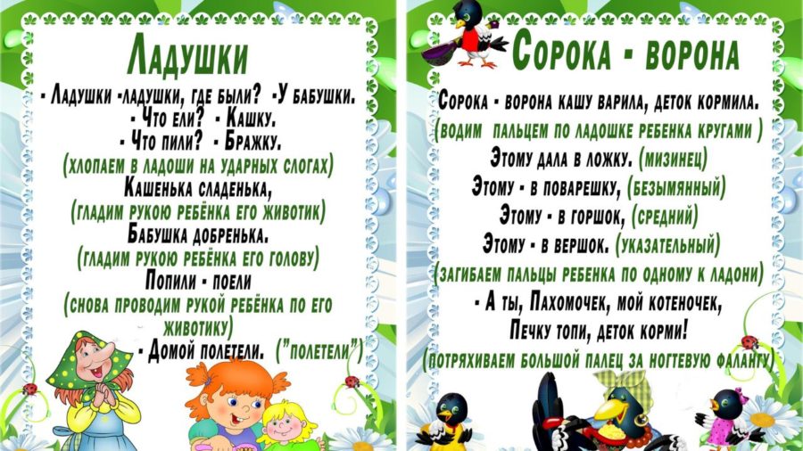 Так называются массажные упражнения для детских пальцев, положительно влияющие на развитие речи и интеллекта в раннем дошкольном возрасте. Работа с пальчиками производится под рифмованный текст, который по смысловому наполнению соответствует производимым действиям. Зачастую пальчиковая гимнастика проводится совместно с физкультминуткой, в этом случае тренируется и мелкая моторика, и все тело. Текстов для пальчиковых упражнений множество, найти их не затруднительно. К пальчиковой гимнастике относятся известные «Ладушки», «Сорока-ворона».