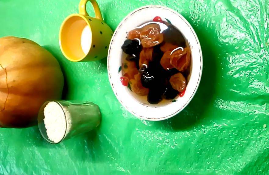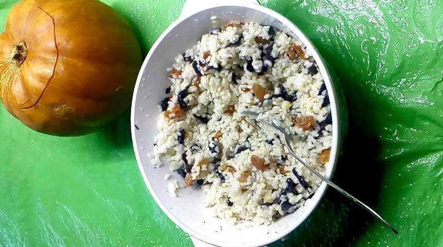 У тыквы отрезать крышку, аккуратно удалить мякоть и семена, не повреждая стенки. Сухофрукты замочить в кипятке до разбухания.