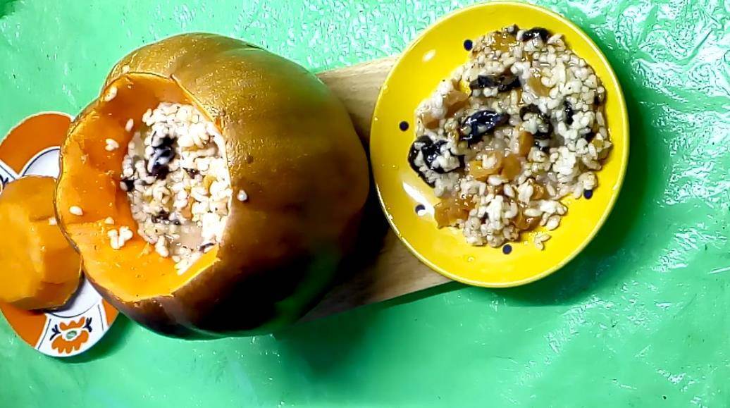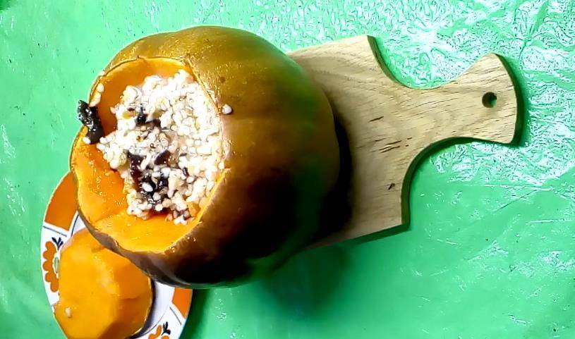 На стол интересная каша подается прямо в тыкве, иногда овощ разрезают на дольки и раскладывают на порционные тарелки. Готовое блюдо получается сочным, нежным, наполненным тыквенными ароматами. Польза его высока, благодаря добавлению в начинку сухофруктов и коровьего молока.
