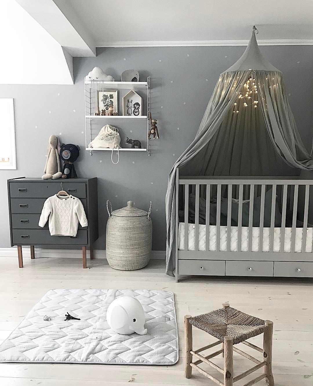 На фото кроватка серого цвета в комнате для новорожденного в скандинавском стиле.
