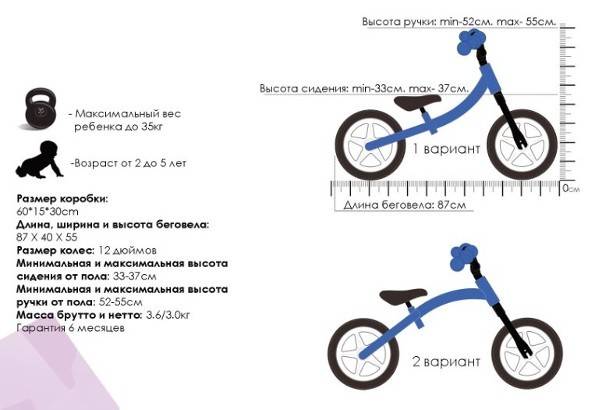 Вес трансформера — до 5 кг. Рама может быть изготовлена из металла либо пластмассы. Беговел выдерживает ребенка, весом до 30 или 40 кг, в зависимости от материала рамы.