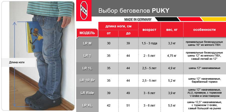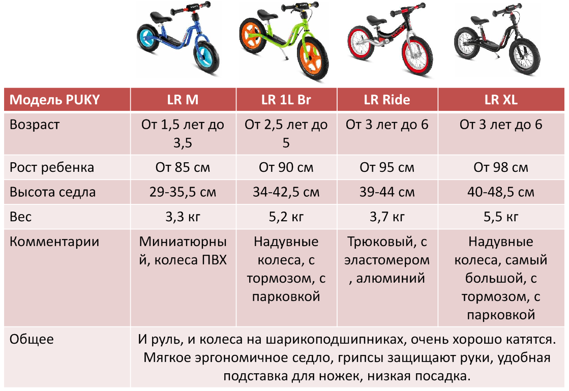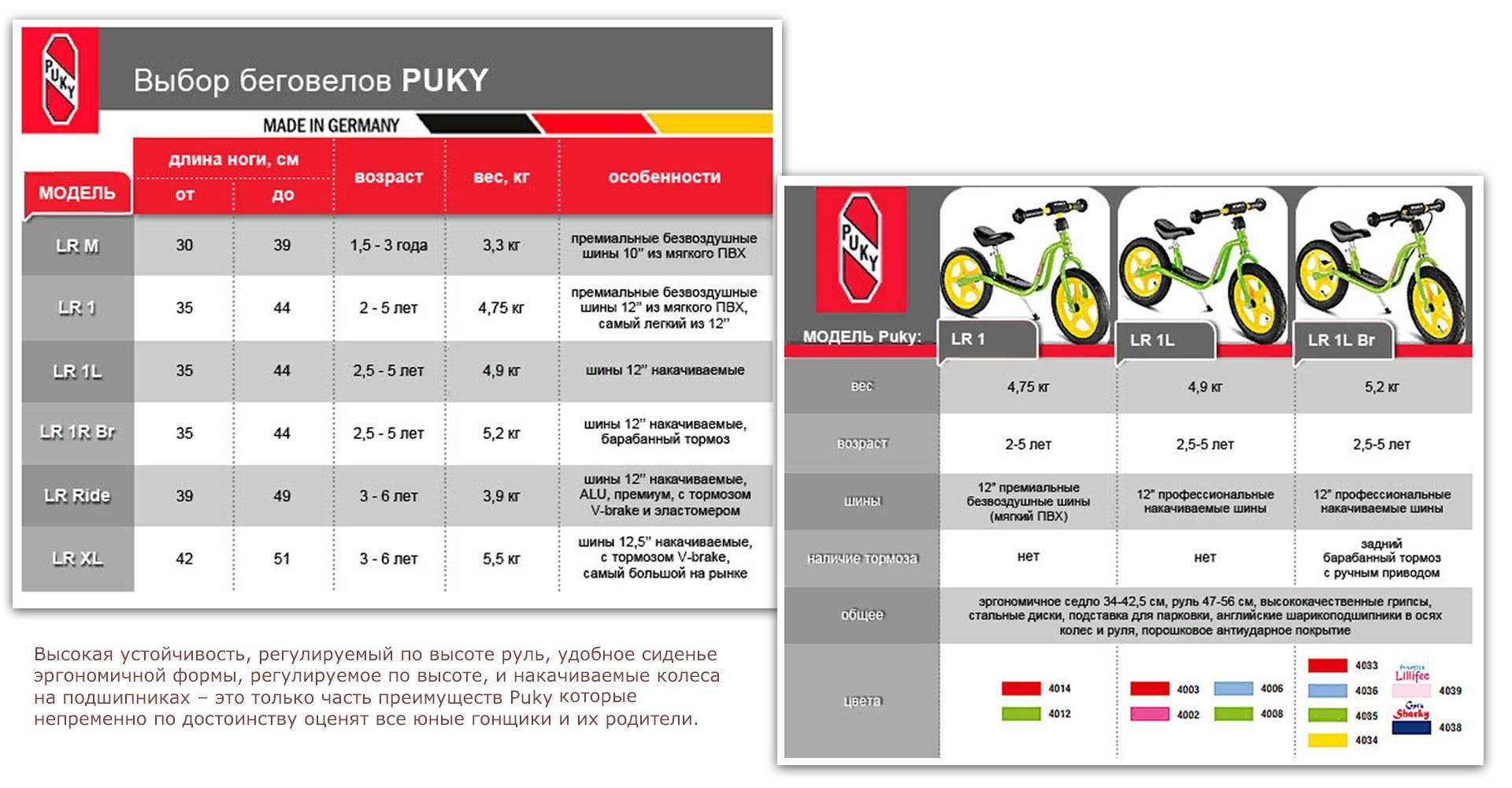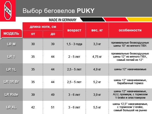 Puky разделили свои модели на три условные категории: маленькие беговелы с двумя или четырьмя колесами для самых юных водителей, беговелы среднего размера для детей ростом не менее 90 см и большие беговелы, которые можно использовать для детей постарше. Практически все велобеги Puky зарекомендовали себя отлично.