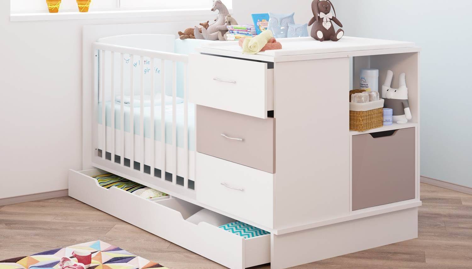 Бонусом к кроватке могут прилагаться нижние ящики для игрушек или постельного белья, пеленальный столик или боковые полочки. У некоторых моделей есть силиконовые защитные накладки на все бортики.
