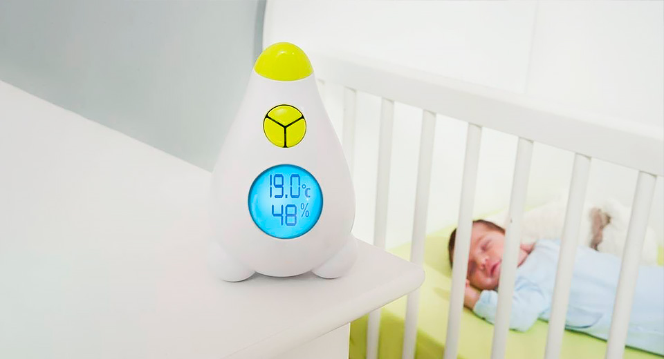 Чтобы контролировать параметры воздуха в комнате, термометр следует размещать рядом с колыбелькой новорождённого, а гигрометр (прибор, устанавливающий, какая влажность в комнате) – подальше от всех отопительных устройств.