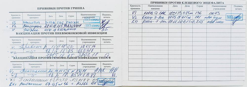 Одна из страниц прививочного сертификата моей дочери. Часть вакцин, например «Превенар» против пневмококковой инфекции, мы делали в поликлинике. От гриппа прививались в частном медицинском центре, а от клещевого энцефалита — частично в поликлинике, частично платно, так как в поликлинике отказывали в ревакцинации раньше чем через год после второй дозы. В прививочном кабинете в этот сертификат вносят информацию о сделанных прививках. Хранится сертификат у родителя