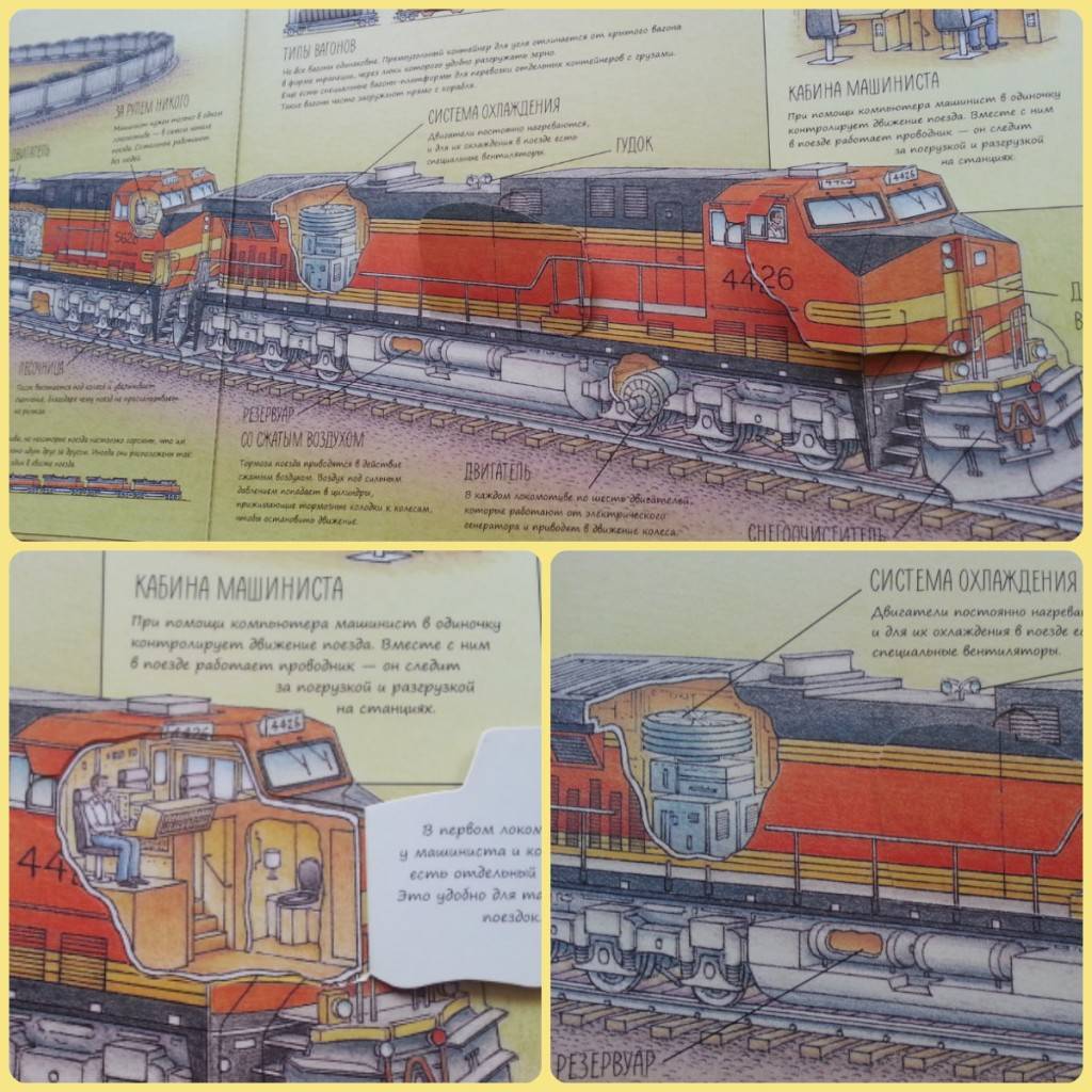 Под каждый вид транспорта в книжке отводится 2 страницы, на которых правдоподобно нарисован внешний вид машины и его внутреннее устройство.