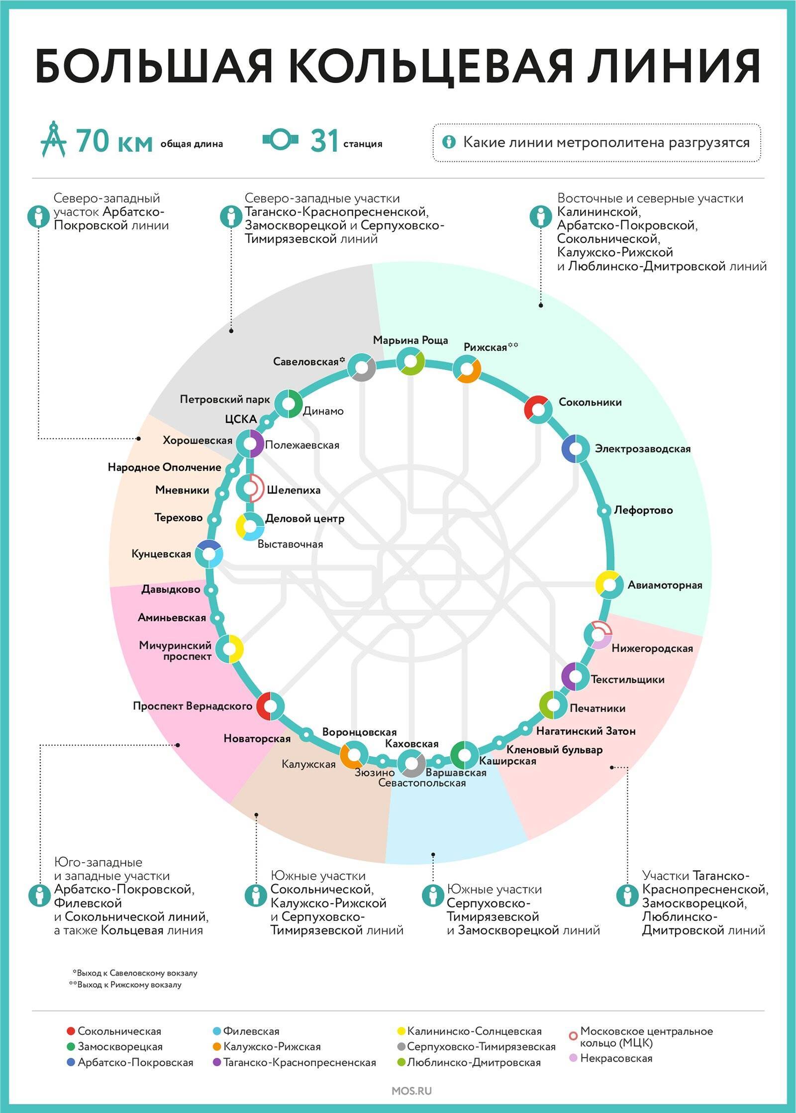 БКЛ может стать самой протяженной кольцевой линией метро в мире. Ее длина составит 70 километров, на кольце разместятся 31 станция и три электродепо (включая участок «Каховская» — «Каширская»). Новое подземное кольцо обеспечит 19 пересадок на радиальные линии метро, четыре — на Московское центральное кольцо и 11 — на станции Московской железной дороги и Московских центральных диаметров.
