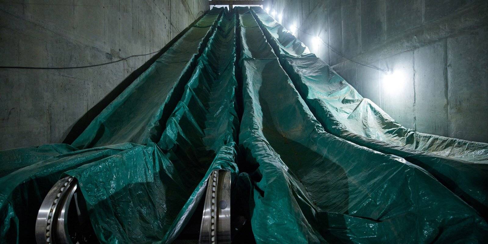 «Это семь этажей вниз. На каждом расположены служебно-технические помещения: вентиляционные камеры, электрощитовые, мастерские, комнаты для персонала, санузлы. Всего около 500 технических помещений. В основном они готовы. Осталась отделка», — объясняет Александр Ситников.